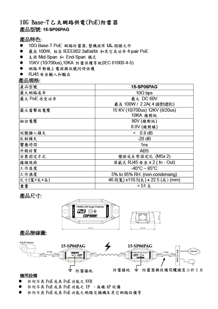 ⚫ 10G Base-T PoE 網路防雷器,整機採用UL 認證元件 ⚫ 最高100W, 相容IEEE802.3af/at/bt 和其它高功率4-pair PoE ⚫ 支持Mid Span 和 End Span 模式 ⚫ 15 KV (10/700us),10KA 防雷保護等級 (IEC 61000-4-5) ⚫ 網路4對線上電源與訊號同時保護